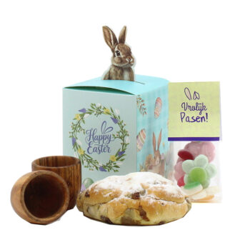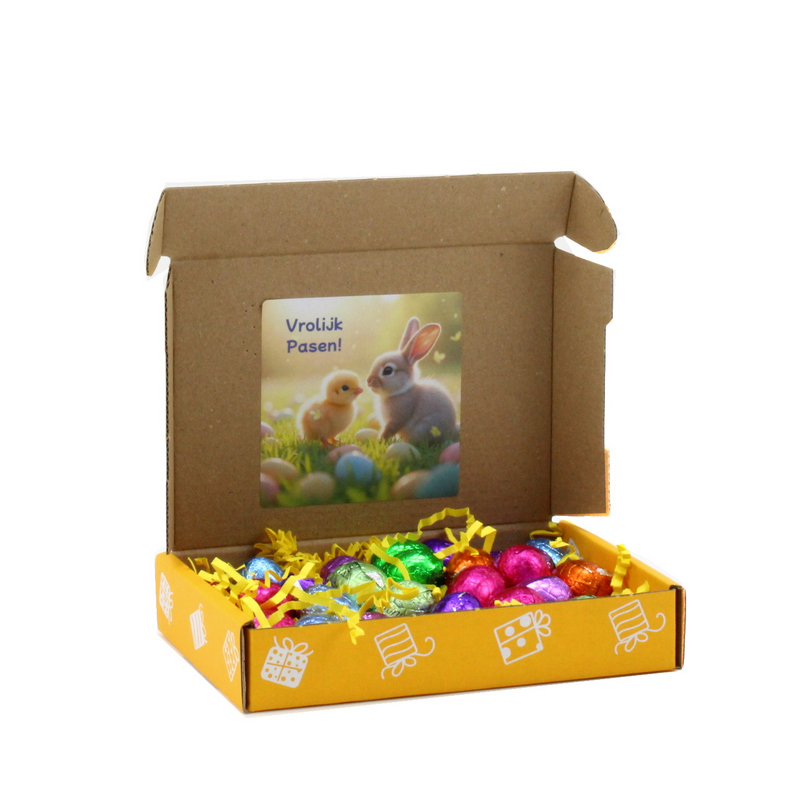 Dit vrolijke brievenbusgeschenk is een echte paasverrassing om iemand fijne paasdagen te bezorgen. In de gele brievenbusdoos ligt een feestelijk nestje van sizzlepak, gevuld met 25 heerlijke chocolade paaseitjes. Aan de binnenzijde van de deksel zorgt een paassticker voor een extra vrolijke finishing touch.
