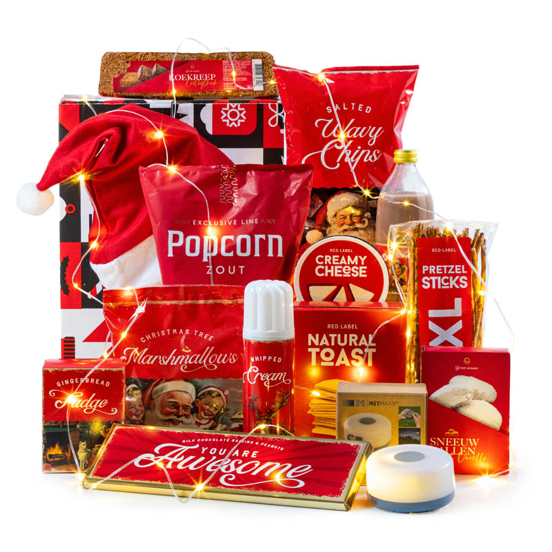 Chic, stijlvol en boordevol lekkers – dit is hét kerstpakket voor iedereen die houdt van een tikkie luxe met een knipoog. Te beginnen met een fles 0.0% bubbels met daarbij diverse hartige snacks. Maar ook aan de liefhebber van zoetigheden is gedacht; een XXL chocolade reep, om je vingers bij af te likken! Perfect voor de fijnproever, borrelfan én feestganger in één.