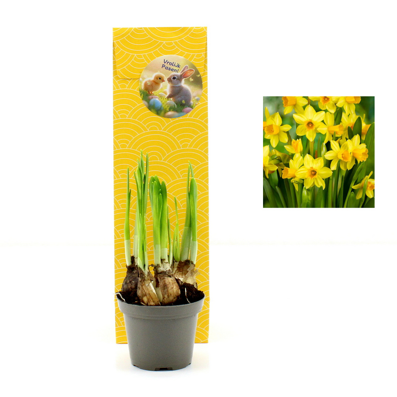 Breng instant lente in huis met deze schattige Narcissus ‘Tête-à-Tête’. Deze narcis barst van de frisgroene blaadjes en zonnig gele bloemen. Klein van stuk, maar groots in uitstraling! Speciaal voor Pasen is deze plant perfect als paasgeschenk. De Tête-à-Tête staat bekend om zijn vroege bloei en makkelijke verzorging. Zet ’m op een lichte plek, geef af en toe wat water en hij doet de rest. Hij wordt geleverd in een feestelijke giftbag, voorzien van een “Vrolijk Pasen” sticker.